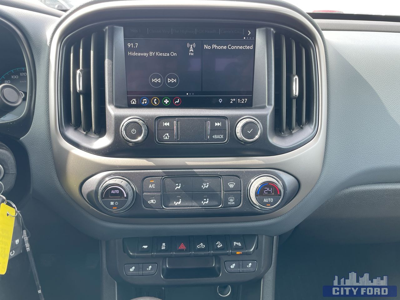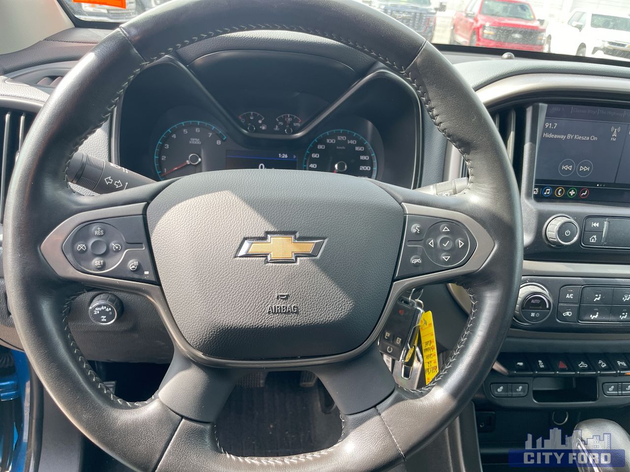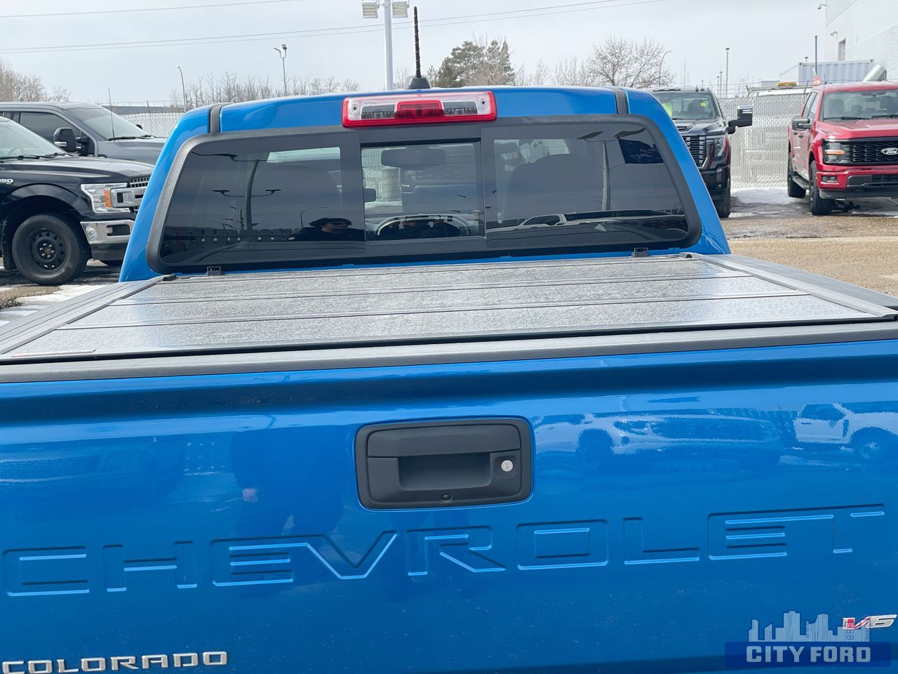 Brakes, 4-wheel antilock, 4-wheel disc, Capless Fuel Fill (Not available with (LWN) 2.8L Duramax Turbo-Diesel engine.), Differential, automatic locking rear, Engine, 3.6L DI DOHC V6 VVT (308 hp [230.0 kW] @ 6800 rpm, 275 lb-ft of torque [373 N-m] @ 4000 rpm), Four wheel drive, Frame, fully-boxed, GVWR, 6000 lbs. (2722 kg) (Standard on Crew Cab models with (LGZ) 3.6L DI DOHC V6 engine only.), Hill Descent Control, Hitch Guidance dynamic single line to aid in truck trailer alignment for hitching, Pickup box, Rear axle, 3.42 ratio, Steering, Electric Power Steering (EPS) assist, Suspension Package, Off-Road, Tow/Haul Mode, Transfer case shield, Transfer case, electric, 2-speed AutoTrac, Black Bowtie, (front grille), Bumper, rear body-colour, Cargo box light, back of cab, CornerStep, rear bumper, Door handles, Black painted, Exterior, B-pillar applique, Fog lamps, front, Headlamps, projector-type, Hood Insulator, Mirror, spotter, located in corner of driver-side outside mirror, Mirrors, outside heated power-adjustable, body-colour, manual-folding (Includes Black mirror caps.), Mouldings, Black beltline, Tailgate handle, Black, Tailgate, EZ-Lift and Lower, Wheel, spare, 17 x 8" (43.2 cm x 20.3 cm) steel, Window, rear-sliding, manual, Audio system feature, 6-speaker system,, HD Radio, Microphones, Driver side and Passenger side, Wi-Fi Hotspot capable (Terms and limitations apply. See onstar.ca or dealer for details.), Air conditioning, single-zone automatic climate control, Chevrolet Connected Access capable (Subject to terms. See onstar.ca or dealer for details.), Console, floor, front compartment, custom, Console, overhead, Cruise control, electronic, automatic, Defogger, rear-window electric, Display, driver instrument information enhanced, multi-colour, Floor covering, colour-keyed carpeting, Handles, door release, front and rear, chrome, Lighting, interior, dual reading, Lighting, interior, roof, rear courtesy and dual reading lights (Crew Cab models only.), Mirror, inside rearview auto-dimming, Remote vehicle starter system, Seat adjuster, driver 6-way power, Seat adjuster, passenger 2-way manual fore/aft with manual recline, Seat adjuster, power driver lumbar control, Seat, rear folding bench (Crew Cab models only.), Speedometer, miles/kilometres, Steering column, tilt and telescopic, Steering wheel controls, mounted audio controls, Steering wheel, heated, Steering wheel, leather-wrapped, Theft-deterrent system, immobilization, Theft-deterrent system, unauthorized entry, USB charging-only ports, 2, located on the rear of the centre console, Visors, driver and front passenger illuminated sliding vanity mirrors, Windows, power with driver Express-Up and Down, Airbags, Dual-stage frontal airbags for driver and front passenger; Seat-mounted side-impact airbags for driver and front outboard passenger; Head-curtain airbags for front and rear outboard seating positions; Includes front outboard Passenger Sensing System for frontal passenger airbag, Daytime Running Lamps, HD Rear Vision Camera, Teen Driver a configurable feature that lets you activate customizable vehicle settings associated with a key fob, to help encourage safe driving behaviour. It can limit certain available vehicle features, and it prevents certain safety systems from being turned off. It includes the Buckle-to-Drive feature which prevents the driver from shifting from Park for up to 20 seconds if the driver's seat belt is not buckled. An in-vehicle report card gives you information on driving habits and helps you to continue to coach your new driver, Tire Fill Alert provides an audible and visual indication when tire pressure is added to a tire that is low. Aids to achieve optimal tire pressure, Tire Pressure Monitoring System (does not apply to spare tire)<br><br>AMVIC LICENSED
